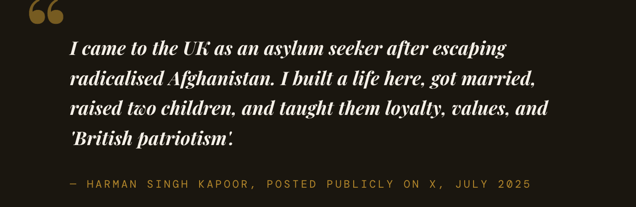 Stirring. Genuinely. A man flees a radicalised country, arrives in Britain, and builds a life. The system extended its protection. The system gave him everything. A beautiful story right up until the same story ends with "And immigrants who came in here to change this beautiful country can fuck off."